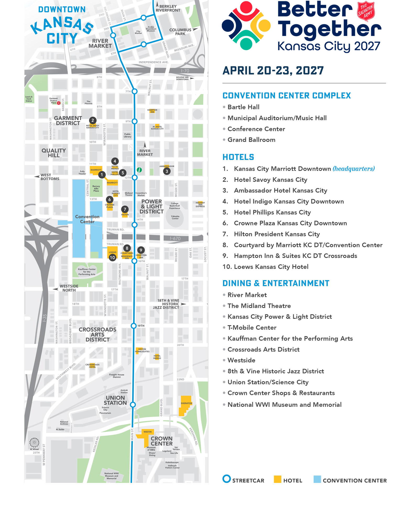 Salvation Army officers and staff should book within the official block. We recommend all attendees book within the official block to receive the negotiated group rate and to stay close to other attendees.